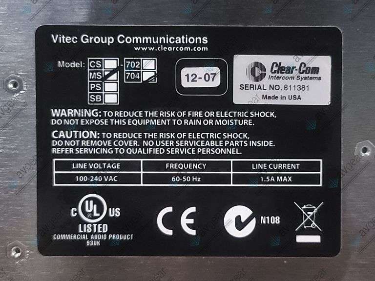 - Rear Panel Connectors: Intercom: XLR-3M (2 per channel), Announce Out: XLR-3M (audio), Program: (1) XLR-3F, Hot Mic / IFB Interface: (1) 1/4 in. (0.64 cm) phone jack, Accessory: (1) DB-15F, AC Power: IEC 320 connector