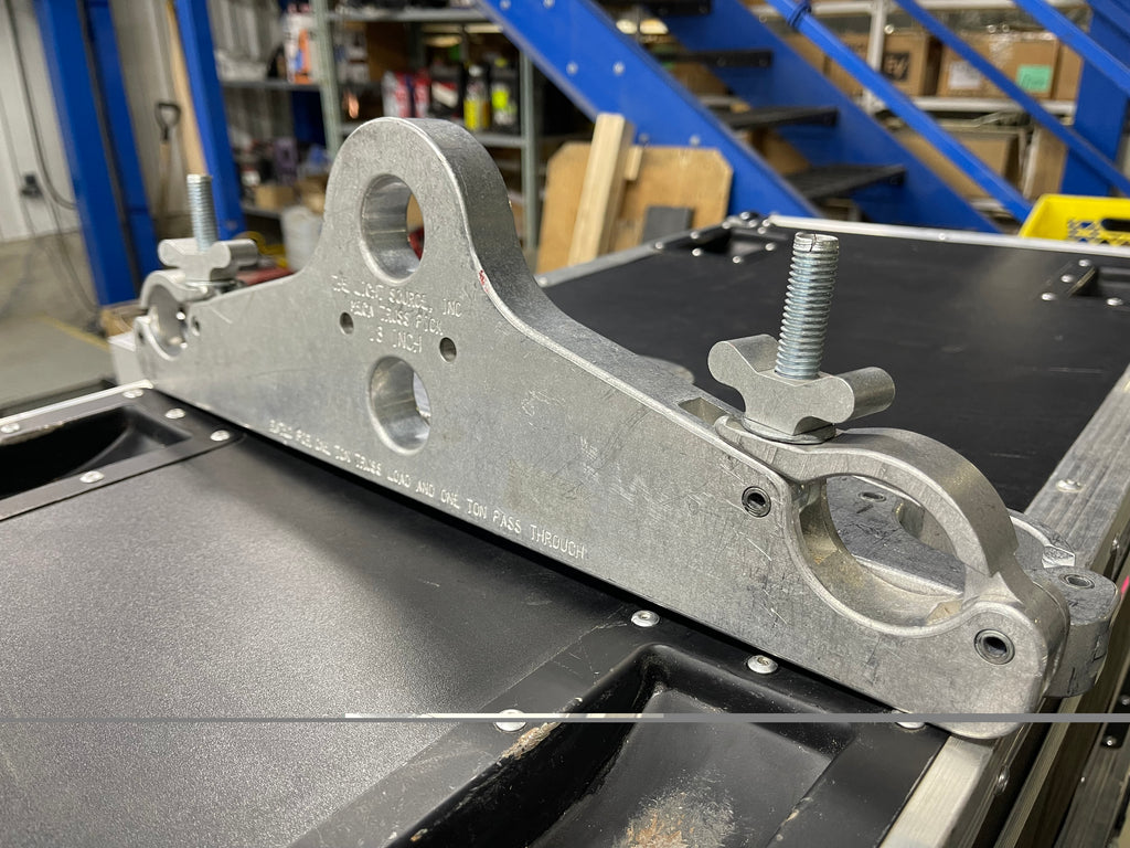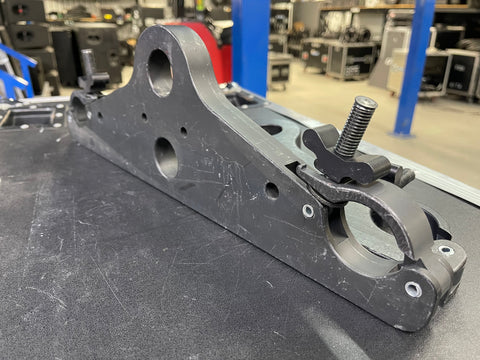 This unit is machined with pockets to support one piece of 18" truss. Truss is secured by two aluminum pivoting links, half inch swivel bolts, and The Light Source's solid wing nuts. This item has two rigging holes for shackles, motor, or chain hook. The Mega-Truss Pick will suspend one ton of truss, and an additional one ton load suspended under the truss.