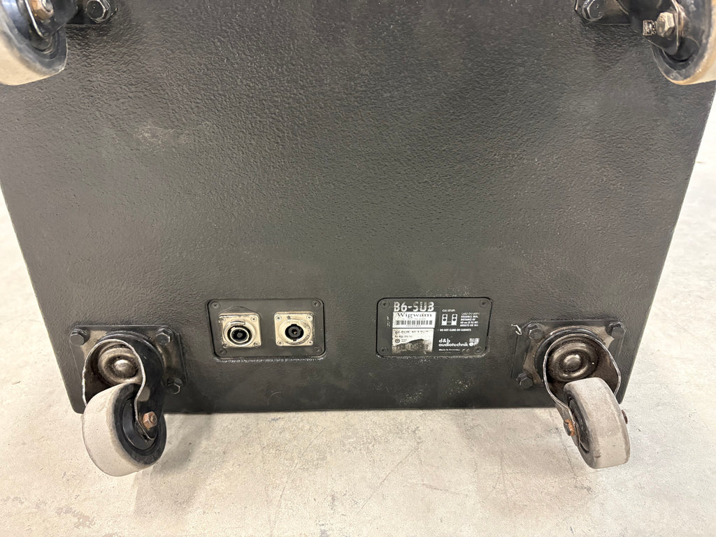 The B6-SUB is a high performance subwoofer designed for ground stacked applications, housing a long excursion 18” driver built into a bass-reflex design. When three or any multiple of three B6-SUBs are used, they can be positioned in a Cardioid Subwoofer Array with one cabinet physically facing backwards and driven by an amplifier channel with CSA mode selected. This achieves exceptional directivity control in lower frequencies and significantly reduces the energy radiating towards to the rear. The cabinet is constructed from marine plywood and has an impact and weather protected PCP (Polyurea Cabinet Protection) finish. The front of the loudspeaker cabinet is protected by a rigid metal grill backed by an acoustically transparent foam, whilst the side panels incorporate two handles. Four wheels are mounted to the rear and the enclosure features two runners to protect the bottom panel from scratching. Two correspondingly shaped recesses are incorporated into the top panel of each cabinet to accept these runners, preventing cabinet movement when stacked. An M20 threaded flange in the top panel accepts the d&b Loudspeaker stand winder M20. An optional transport lid protects the front of the subwoofer during transit.